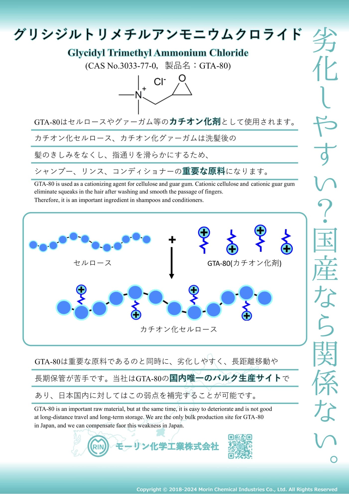 シャンプー・リンス・コンディショナーなどを作る上で必要なカチオン化セルロース、カチオン化でんぷんを製造するための重要原料です。その他、カチオン化剤としての性能を基に、様々な用途に展開されます。